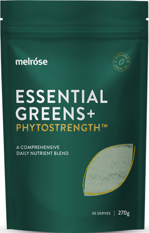 Melrose Essential Greens+ Phytostrength combines 35+ organic supergreens, prebiotics and phytonutrients to support digestion, energy and mental focus, with a naturally refreshing apple and blackcurrant flavour. No grassy aftertaste, just clean, effective nutrition.