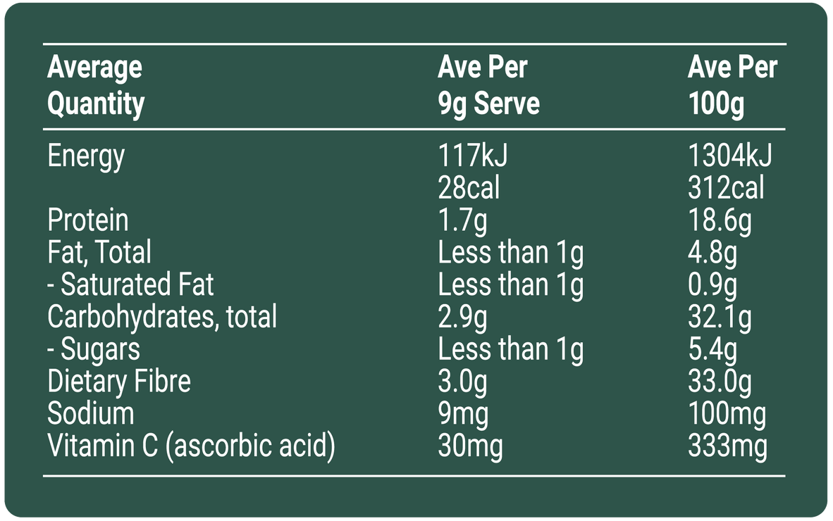 Organic Essential Greens Blend (Barley Grass (Hordeum vulgare), Wheatgrass (Triticum aestivum), Spirulina (Spirulina plantensis), Chlorella (Chlorella vulgaris)), Organic Acacia Gum, Organic Hemp Protein, Organic Apple Flavour, Organic Blackcurrant Flavour, Organic Green Banana Flour, Organic Acerola Powder, Organic Pineapple Powder, Organic Sunflower Lecithin, Organic Fermented Greens Blend (Green Lentil, Mung Bean, Spinach, Broccoli, Kale, Pepitas, Linseed, Chia Seed, Dandelion Root, Parsley), ViBERi™ Organic Blackcurrant Powder, Organic Maca Powder, Organic Tremella Mushroom, Organic Cordyceps Mushroom Powder, Monk Fruit Extract, Aquamin™ F Natural Sea Minerals, Panax Ginseng Root Powder, Organic Kelp Powder, Queen Garnet Plum, Xanthan Gum, Organic Guar Gum.
