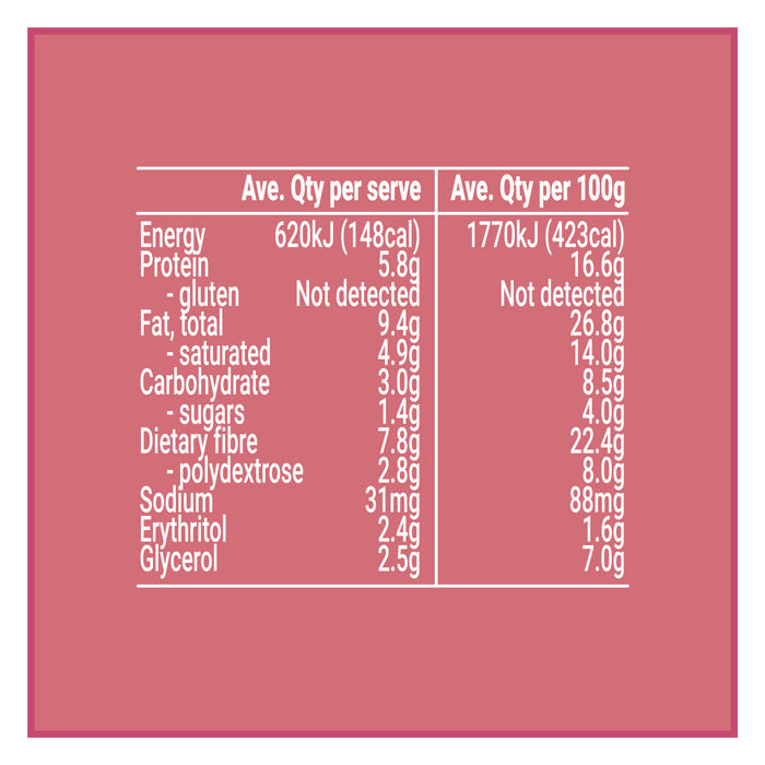 Nut Blend (37%) [Coconut, Almonds, Cashews], Soluble Tapioca Fibre, Faba Bean Protein, Sweetener (Polydextrose), Humectant (Vegetable Glycerine), Cocoa Powder (4.6%), No Added Sugar Dark Chocolate Chips (4.6%) [Maltitol, Cocoa Solids, Soy Lecithin, Natural Vanilla Flavour], Natural Flavours, Vegetable Fibre, Sea Salt, Vitamin E. Contains: Almonds, Cashews, Soy May Contain: Brazil Nuts, Hazelnuts, Macadamia, Peanuts, Pecans, Pine Nuts, Pistachios, Sulphites, & Walnuts