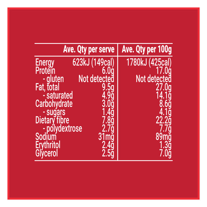 Nut Blend (38%) [Coconut (15.5%), Almonds, Cashews], Soluble Tapioca Fibre, Faba Bean Protein, Sweetener (Polydextrose), Humectant (Vegetable Glycerine), No Added Sugar Dark Chocolate Chips (4.6%) [Maltitol, Cocoa Solids, Soy Lecithin, Natural Flavour], Cocoa Powder (4.6%), Natural Flavour, Natural Cherry Flavour (0.20%), Vegetable Fibre, Sea Salt, Vitamin E. Contains: Almonds, Cashews, Soy May Contain: Brazil Nuts, Hazelnuts, Macadamia, Peanuts, Pecans, Pine Nuts, Pistachios, Sulphites, & Walnuts