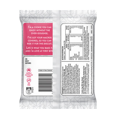 Protein Blend (47%)[Calcium Caseinate(from Milk, with Monoglycerides), Almonds, Egg], Sweetener (Erythritol), No Added Sugar White Compound Choc Chips (10%) [Sweetener (erythritol), Vegetable Fat (Palm Kernel Oil), Soy Protein Isolate, Milk Solids, Emulsifier (Soy Lecithin), Natural Vanilla Flavour] Vegetable Oil Spread [Palm Oil, Coconut Oil, Water, Salt, Emulsifier (Mono and Diglycerides of Fatty Acid, Soy Lecithin)] Antioxidant (Mixed Tocopherols Concentrate), Natural Butter Flavour, Citric Acid, Colour (Carotene), Bulking Agent (Polydextrose), Humectant (Vegetable Glycerol), Emulsifier (Soy Lecithin), Baking Powder Natural Raspberry Flavour, Sea Salt. Contains: Egg, Milk, Soy, Almond May Contain: Peanut, Wheat, Gluten, Hazelnut and Treenuts. Excessive consumption may have a laxative effect.