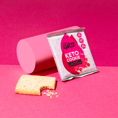 Included Keto Cookies: x1 Raspberry White Chocolate 60g & x1 Choc Fudge 60g.