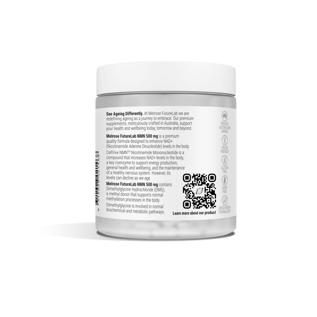 A new era in longevity nutrition has arrived - Melrose FutureLab NMN 500mg capsules provide NMN in a once daily format designed to support NAD+ levels and cellular energy production.