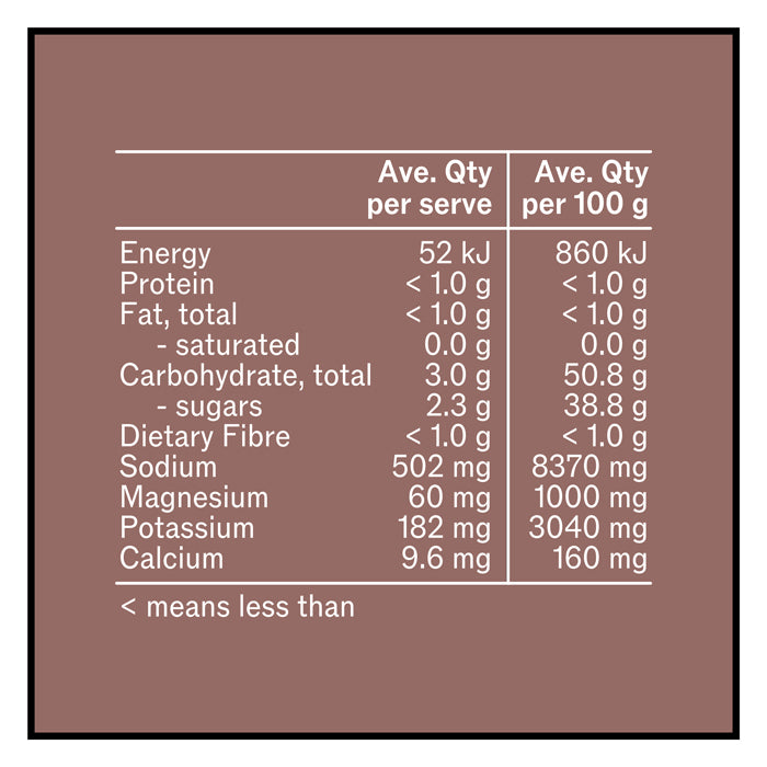 Coconut Water Powder, Salt, Magnesium Citrate, Natural Cola Flavour (Sulphites), Silicon Dioxide, Potassium Salt, Carrot Concentrate, Citric Acid, Aquamin F, Natural Sweetener (Thaumatin).