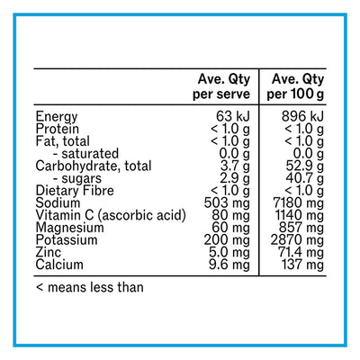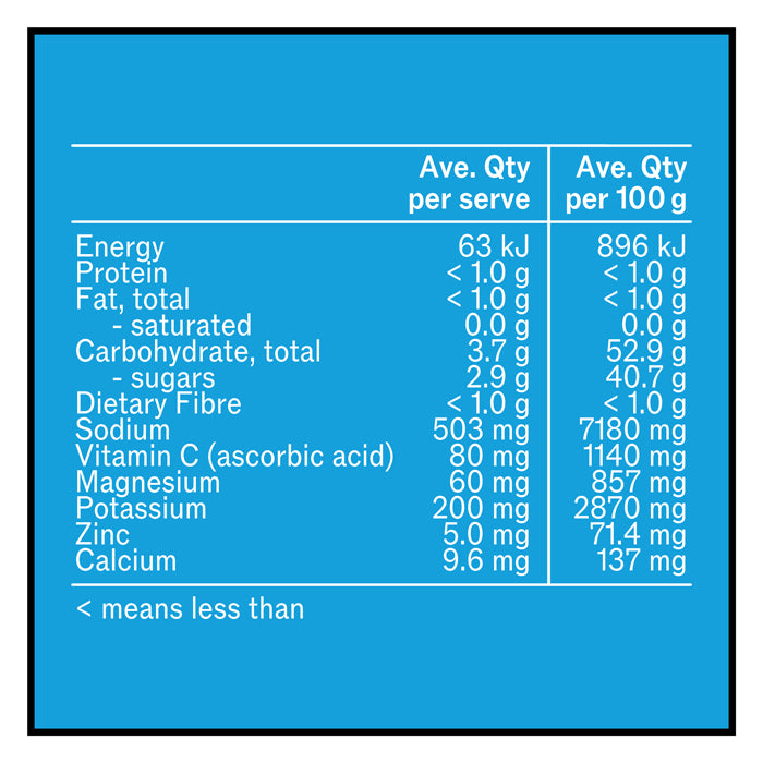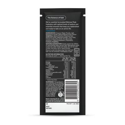 Coconut Water Powder, Salt, Magnesium Citrate, Natural Blackcurrant Flavour (Sulphites), Silicon Dioxide, Potassium Salt, Vitamin C (Ascorbic acid), Zinc Gluconate, Aquamin F, Natural Sweetener (Thaumatin).