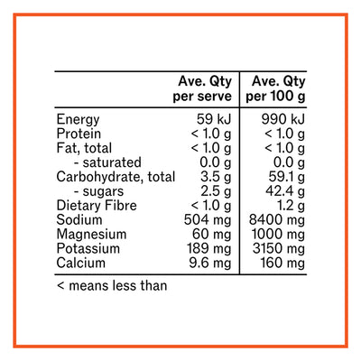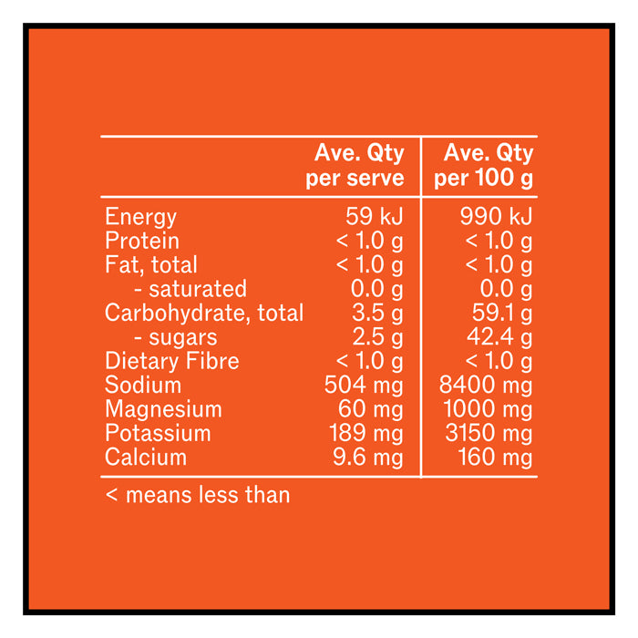 Coconut Water Powder, Salt, Magnesium Citrate, Silicon Dioxide, Potassium Salt, Natural Orange Flavour (Sulphites), Turmeric Powder, Citric Acid, Aquamin F, Natural Sweetener (Thaumatin).