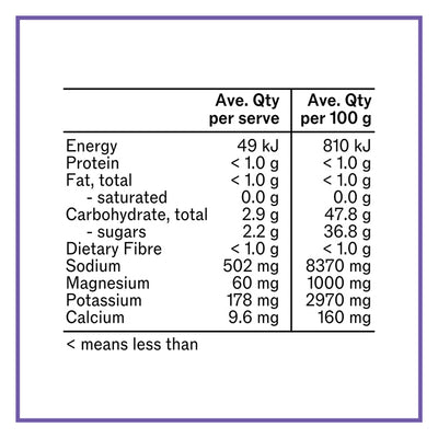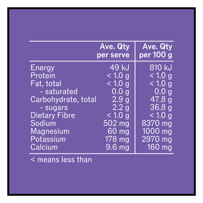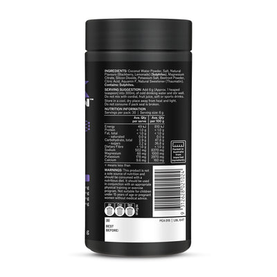 Coconut Water Powder, Salt, Natural Flavour (Blackberry, Lemonade) (Sulphites), Magnesium Citrate, Silicon Dioxide, Potassium Salt, Beetroot Powder, Citric Acid, Aquamin F, Natural Sweetener (Thaumatin).