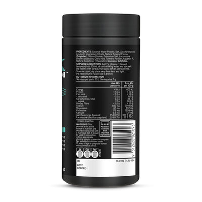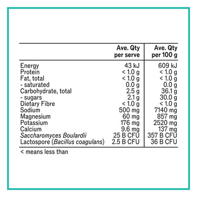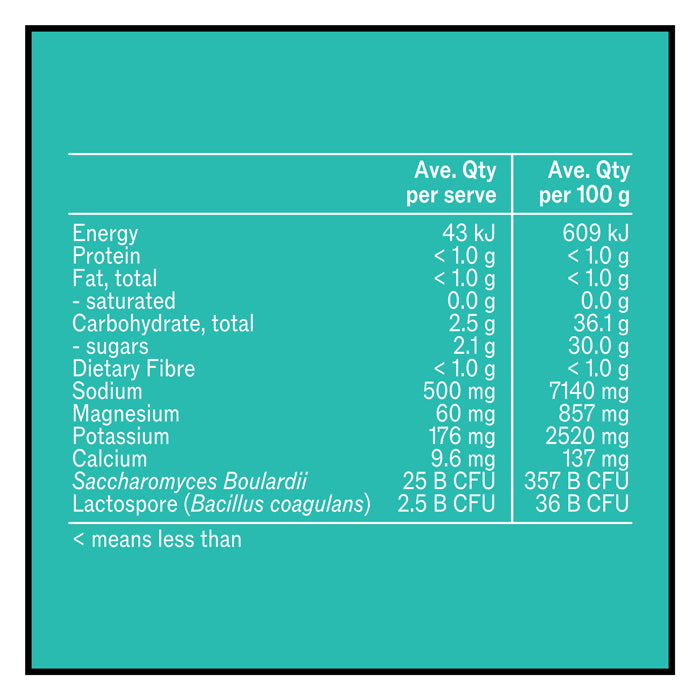 Coconut Water Powder, Salt, Saccharomyces boulardii, Magnesium Citrate, Natural Tropical Flavour (Sulphites), Silicon Dioxide, Potassium Salt, Lactospore Bacillus coagulans, Citric Acid, Turmeric Powder, Aquamin F, Natural Sweetener (Thaumatin).