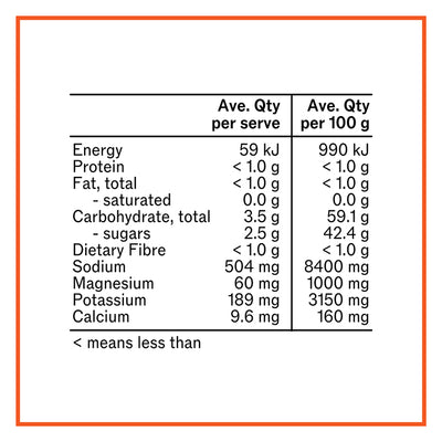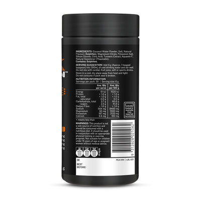 Coconut Water Powder, Salt, Magnesium Citrate, Silicon Dioxide, Potassium Salt, Natural Orange Flavour (Sulphites), Turmeric Powder, Citric Acid, Aquamin F, Natural Sweetener (Thaumatin).