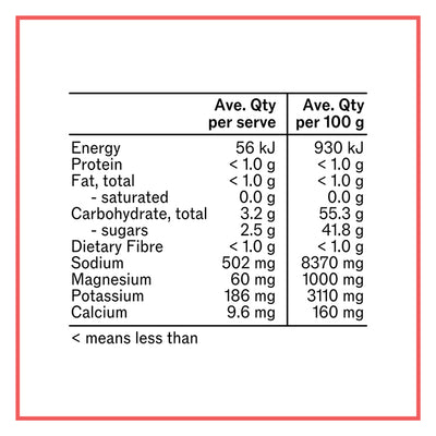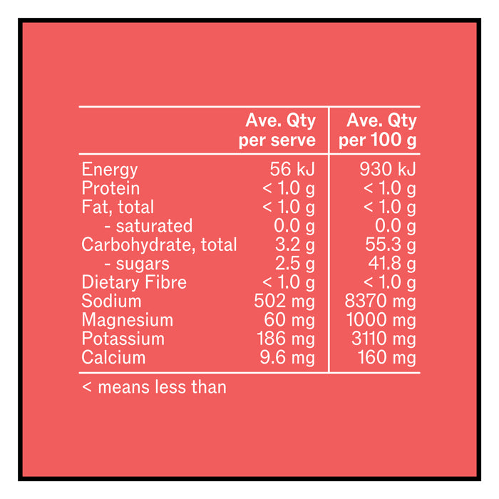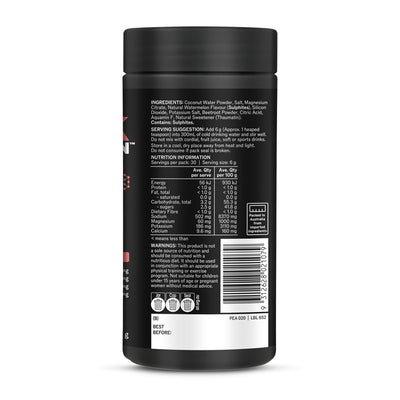 Coconut Water Powder, Salt, Magnesium Citrate, Natural Watermelon Flavour (Sulphites), Silicon Dioxide, Potassium Salt, Beetroot Powder, Citric Acid, Aquamin F, Natural Sweetener (Thaumatin).