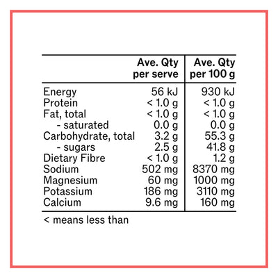 Coconut Water Powder, Salt, Magnesium Citrate, Natural Watermelon Flavour (Sulphites), Silicon Dioxide, Potassium Salt, Beetroot Powder, Citric Acid, Aquamin F, Natural Sweetener (Thaumatin).